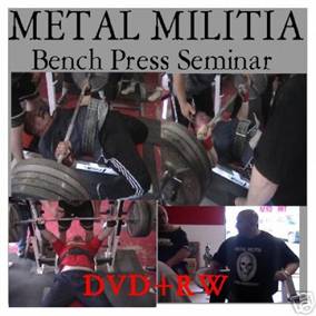 A awesome bench press DVD .This is 86 mins fully edited seminar I did a few months Ago in Las Vegas. This DVD covers everything from setting up ,Shirt Bench Pressing, Rack and Board work along with many people trying to learn the metal militia Bench Style. If you have never been to a Metal Militia Seminar then this is the next best thing. I also conclude this video with a very informative Q & A This DVD would be great for any powerlifter or bench presser wanting to learn how to improve your bench. |
